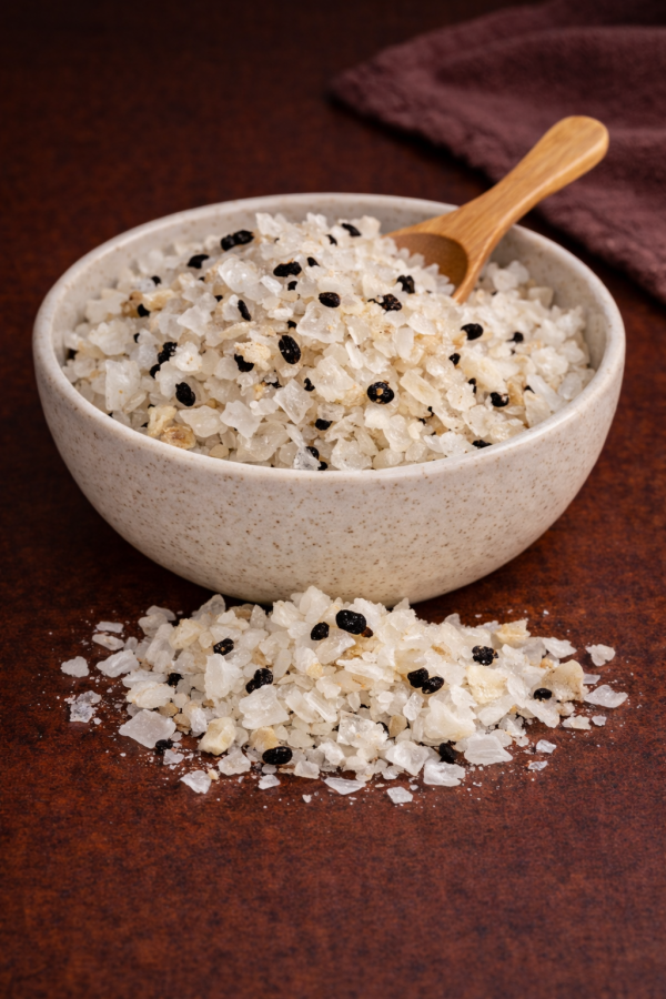 Φυσικές θαλασσινές νιφάδες αλατιού, φύλλα άγριου σκόρδο , άρωμα άγριου σκόρδο